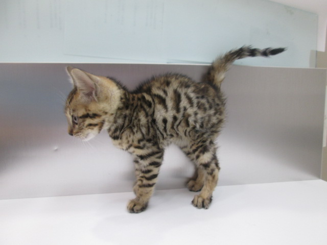 毛色は人気のブラウンスポテッドタビー色になり、全体(お顔や胴や尾)にベンガルの最大の特徴である