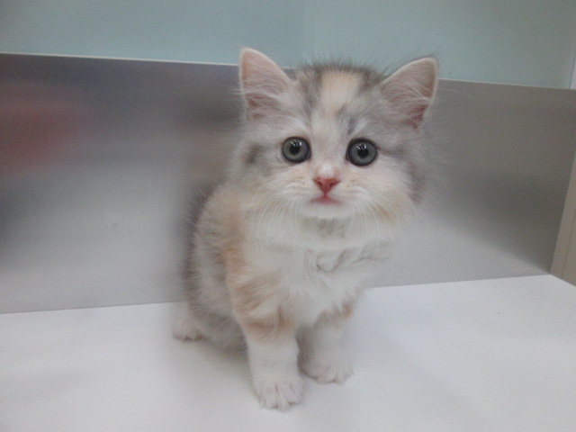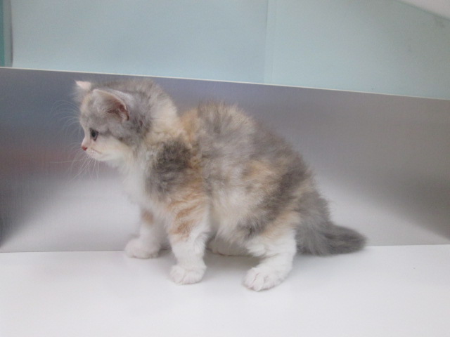 毛色は希少なダイリュートキャリコ(薄い三毛)になり全体的に三色の毛色が