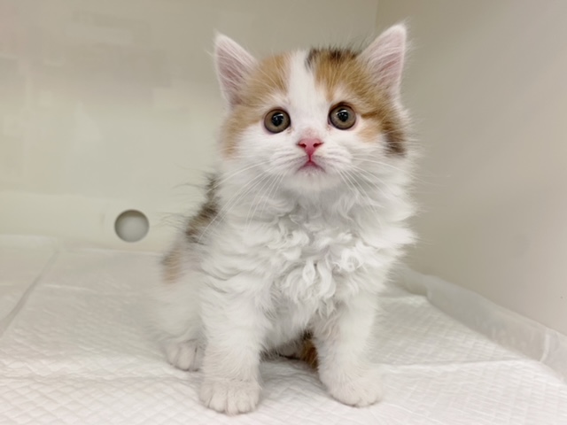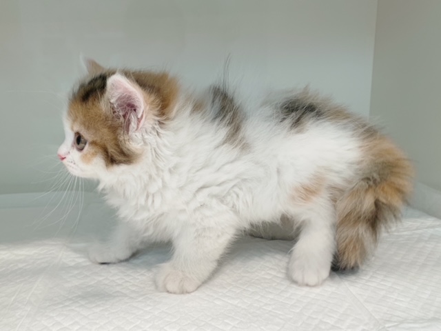 毛色は綺麗な3色のキャリコ(三毛)になりホワイト色の毛色をベースにお顔や尾にバランスよく3色の毛色が程よく配色されとっても綺麗でお洒落です!!